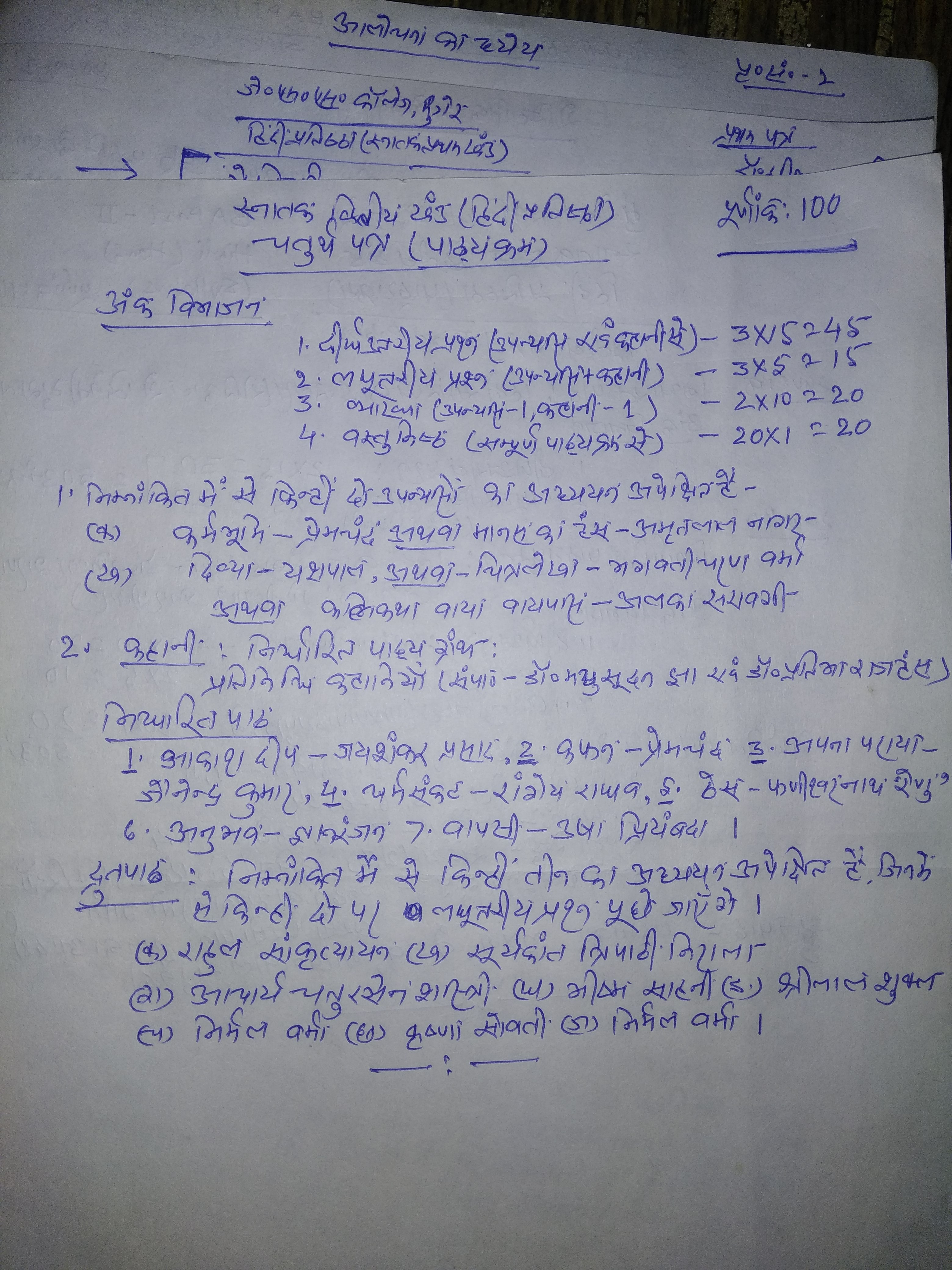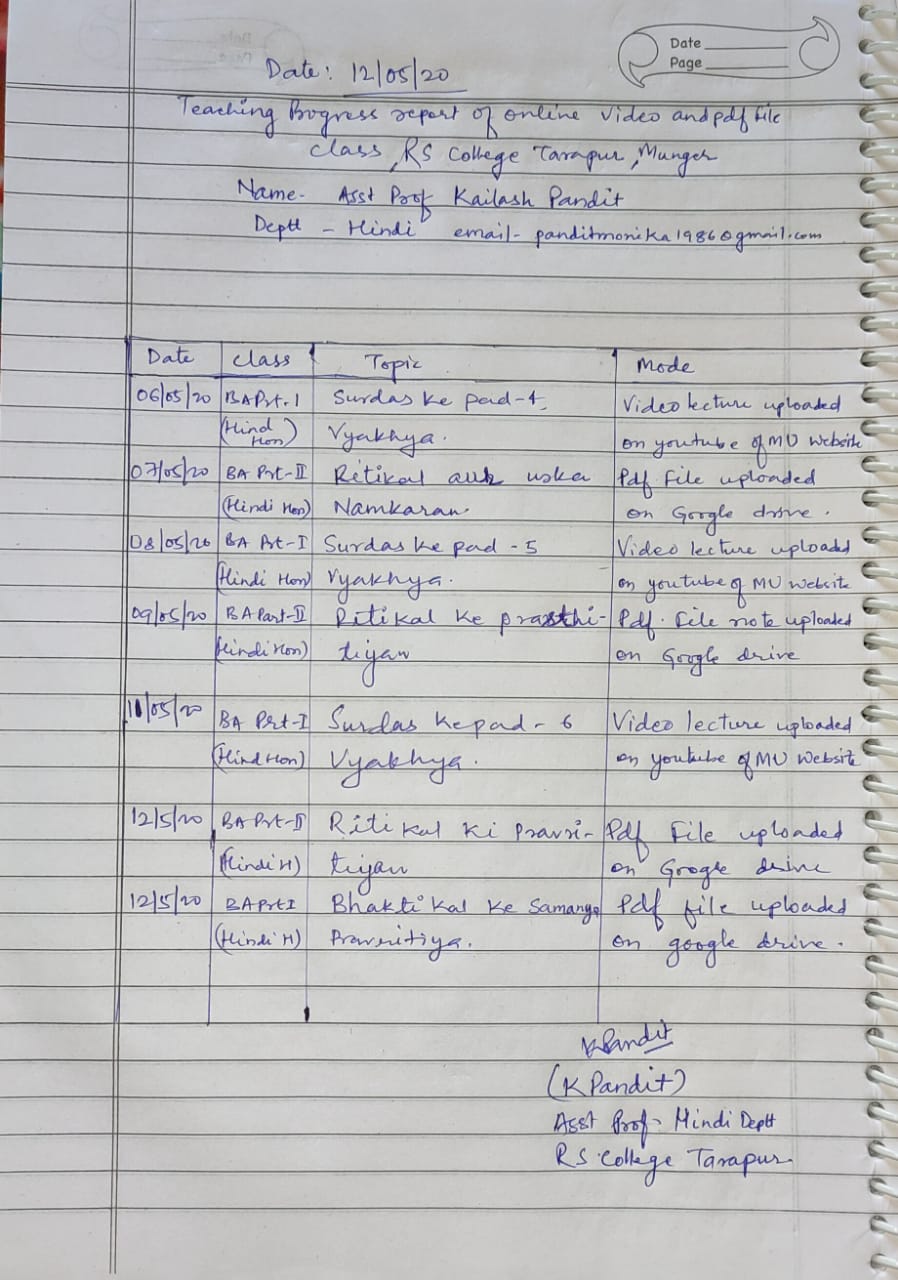 | 232 | BA - II | Hindi | चतुर्थ पत्र वस्तुन | Pr. Harischandra Shahi | 08-05-2020 |