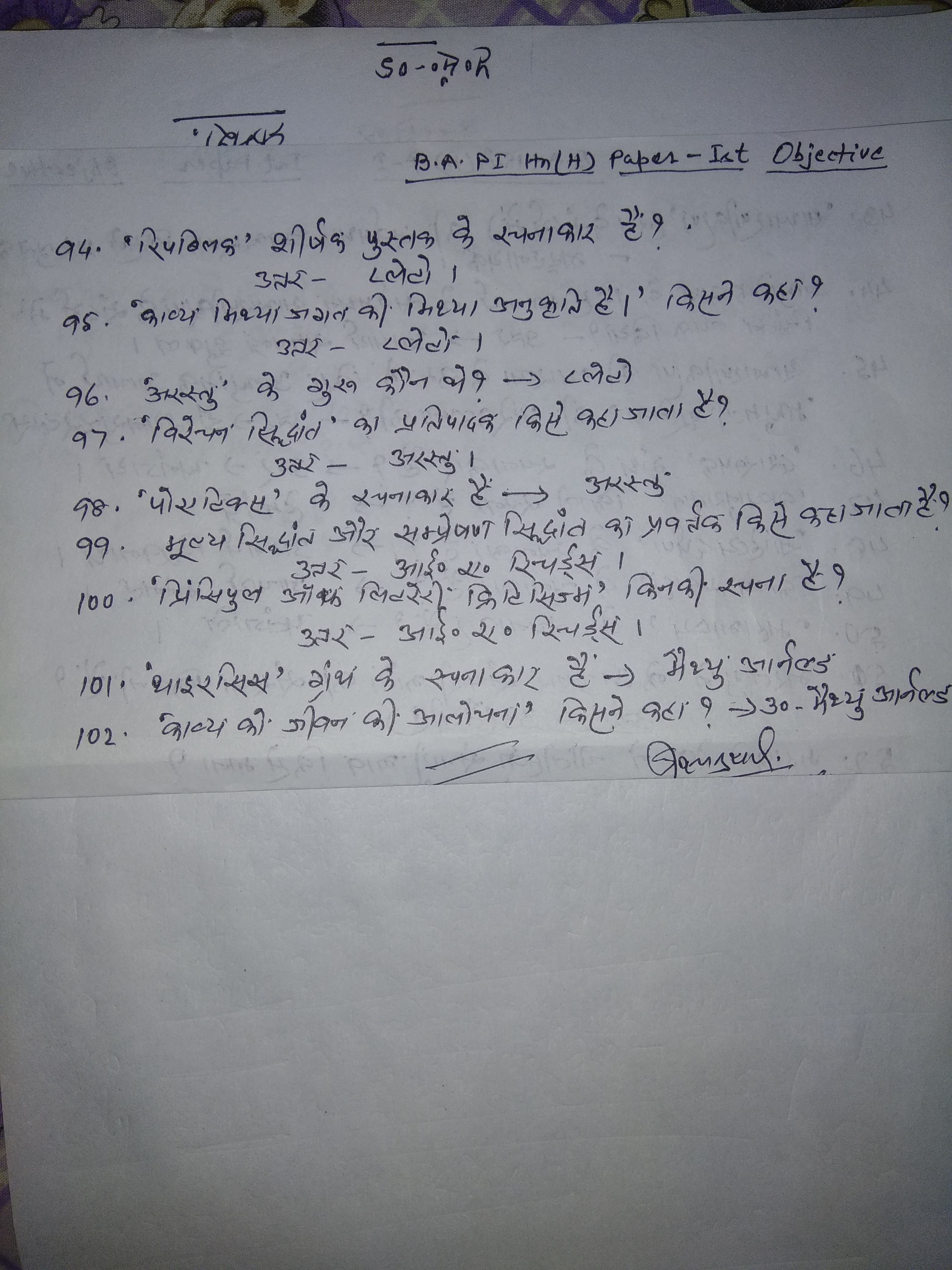 | 201 | BA - I | Philosophy | Paper-I, Obj Type Qstns-true/False | Dr. Ram Narayan Sharma | 26-05-2020 |
